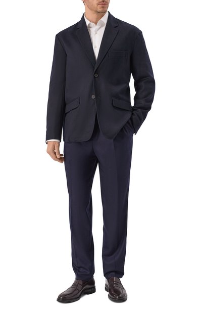 Слегка приталенный пиджак выполнили из шерсти первого пострига. Модель с двумя боковыми карманами дополнили еще одним внутренним и нагрудной листочкой.