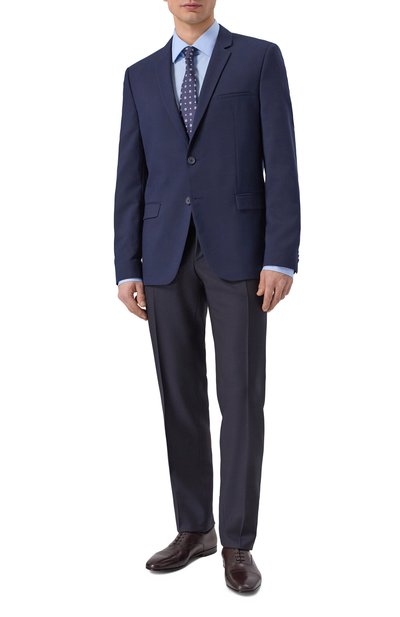 Слегка приталенный пиджак выполнили из шерсти первого пострига. Модель с двумя боковыми карманами дополнили еще одним внутренним и нагрудной листочкой.