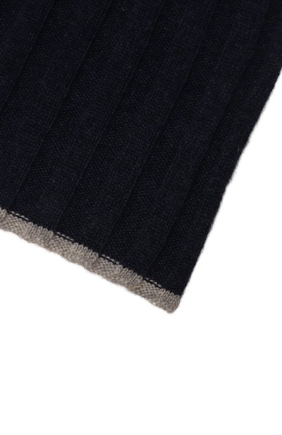 Шарф выполнили чулочной вязкой из чистой шерсти первого пострига. Принадлежность аксессуара бренду подчеркнули геральдическим патчем, которому вторят полосы на ребристых концах.