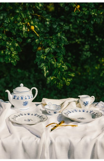 Придуманный в 1970-х орнамент Chateaubriand избавили от золотых акцентов, сконцентрировав внимание на самодостаточной простоте цветочного венка. Получившийся мотив нанесли на стенки чайника, поддержав декор узким кантом на дне, волнистом горлышке и крышке. Синий узор кажется особенно ярким на фоне белоснежного лиможского фарфора, к оторый надолго сохраняет температуру заварки.