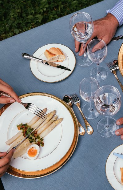Чтобы создать эту пару ножей, объединились мастера двух старинных французских компаний — Bernardaud и Opinel. Дизайн столовых приборов олицетворяет баланс хрупкости и силы, воплощенный в сочетании лиможского фарфора и нержавеющей стали. Изящный орнамент Albertine, переходящий с рукоятки на изогнутое лезвие, символически соединяет эти два контрастных материала.
