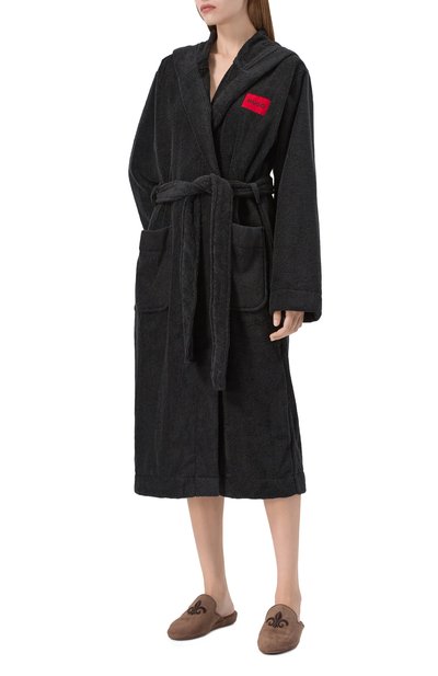 Халат с шалевым воротником, капюшоном и парой накладных карманов выполнили из махрового хлопка. Модель, декорированную брендированным патчем спереди, дополнили съемным поясом, регулирующим запах.