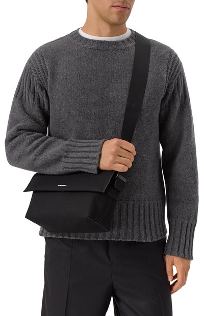 Стеганую сумку-мессенджер с наполнителем изготовили из гладкого текстиля. Принадлежность аксессуара линии Jil Sander+ подчеркнули небольшим контрастным логотипом. Внутри аксессуар на молнии дополнили тремя открытыми карманами.