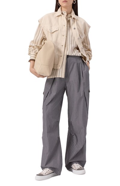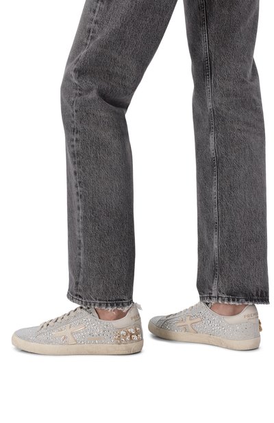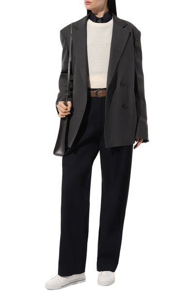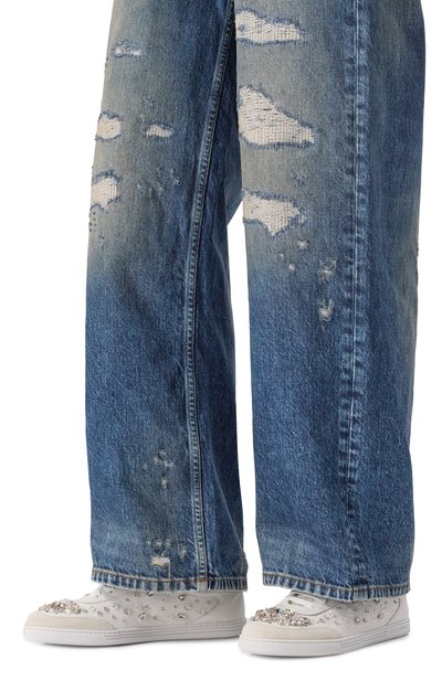 Кеды из металлизированного материала с узором GG Supreme укрепили серебристой кожей. Язычок украсили брендированным патчем, а задник – эмблемой Interlocking G. Пару установили на широкую резиновую подошву с логотипом марки.