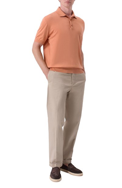 Эспадрильи на прорезиненной джутовой подошве выполнили из текстиля с шевронным узором, укрепив швы и края пары мелкозернистой кожей. Союзку подчеркнули логотипом марки и цветной полоской, повторяющейся на складном заднике.