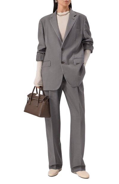 Брюки из шерстяного трикотажа составят гармоничный дуэт с парным пуловером. По бокам модель с эластичным поясом дополнили кнопками, которые можно расстегнуть, сформировав разрезы.