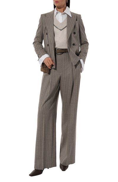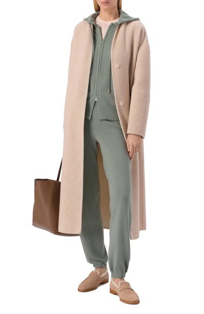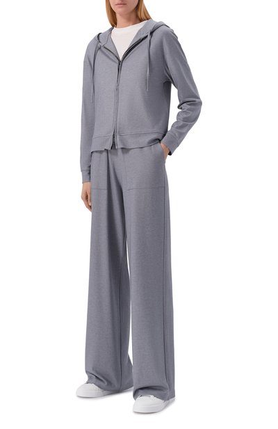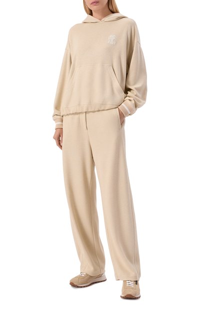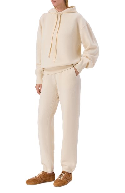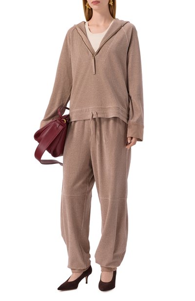 Худи со спущенной линией плеч сшили из кашемирового трикотажа с петельчатой изнанкой. Через кули ску капюшона пропустили длинную ленту в тон, а спереди разместили треугольную вставку в рубчик.
