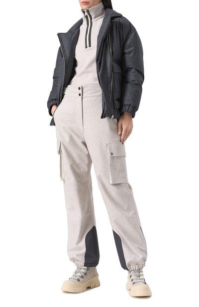 Облегающее поло в тонкий рубчик выполнили из микса кашемира и шелка. Манжеты и пояс подчеркнули полоской в цветах ленты Web, а внутреннюю сторону пуговичной планки украсили логотипом.