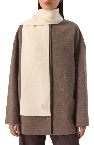 Шарф с вязаным микроузором выполнили из чистого кашемира. Аксессуар сможет дополнить образ с вещами и светлой, и темной гаммы.