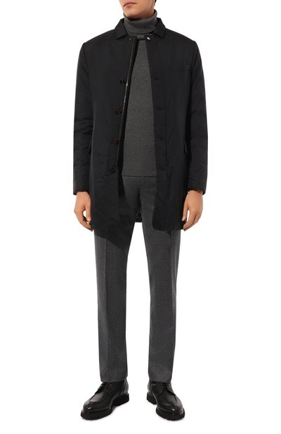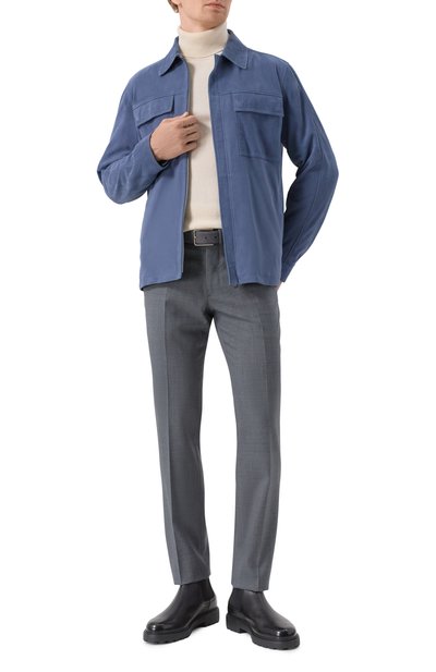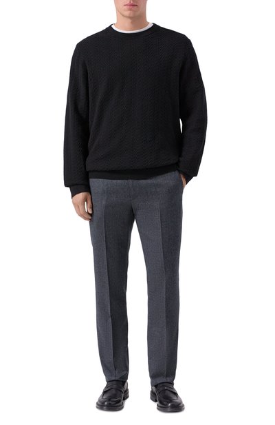 Слегка зауженные брюки Spiaggia со стрелками дополнили поясом-кулиской c эластичными вставками. Для пошива модели с тремя карманами, отделанными кантом из алькантары, использовали чистую шерсть.