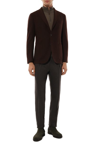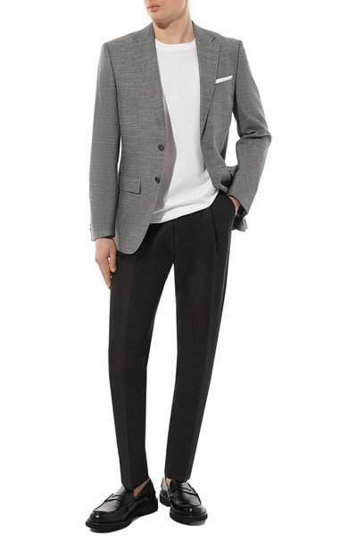 Брюки со стрелками выполнили из эластичной костюмной шерсти с добавлением кашемира. Модель со шлевками для ремня дополнили парой боковых, монетным и двумя задними карманами.