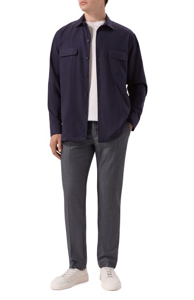 Для пошива брюк со стрелками использовали эластичную шерсть с микроузором. Модель с классической посадкой дополнили пятью врезными карманами.