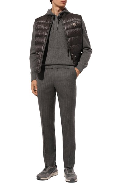 Брюки со стрелками дополнили двумя карманами по бокам и листочкой сзади. Для изготовления модели с эластичным поясом-кулиской использовали костюмную шерсть в меловую полоску.