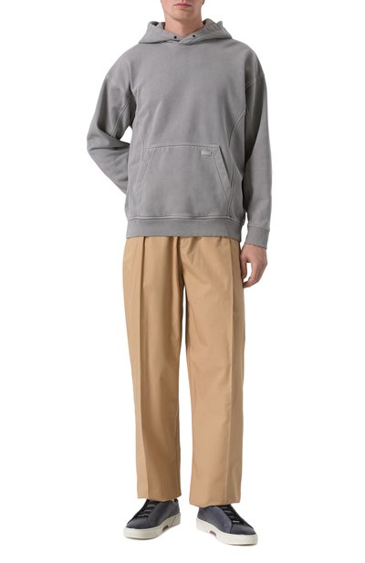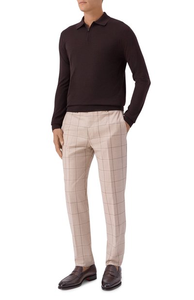 Брюки с эласт ичным поясом-кулиской выполнили из шерстяной фланели в меловую полоску. Помимо боковых карманов предусмотрели и задний.