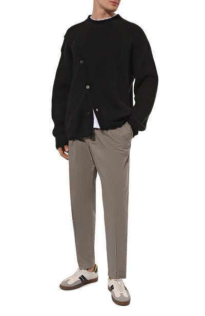 Брюки с эластичным поясом-кулиской выполнили из шерстяной фланели в меловую полоску. Помимо боковых карманов предусмотрели и задний.