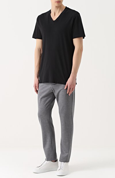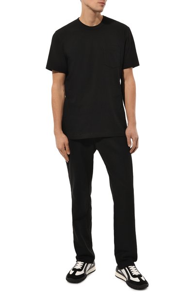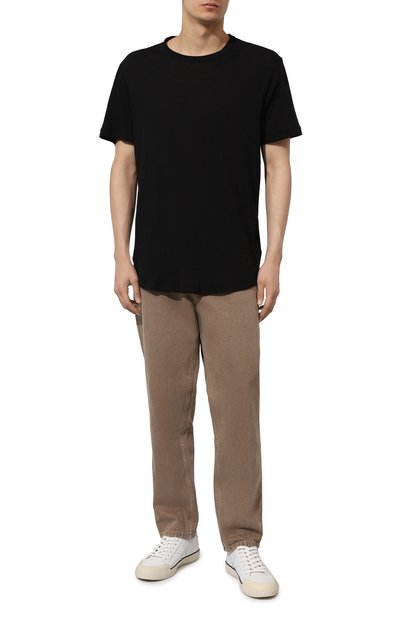 Футболку с круглой горловиной и слегка спущенной линией плеч выполнили из хлопкового джерси. Принадлежность марке обозначили металлизированным логотипом марки спереди.