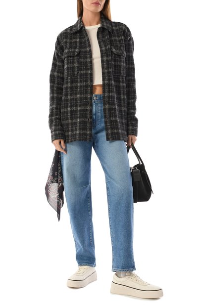 Oversize-рубашка из хлопковой фланели с клетчатым мотивом, подчеркнутым кристальной аппликацией, застегивается перламутровыми кнопками. Модель с фигурным низом и закругленными манжетами дополнили нагрудными карманами с клапанами.