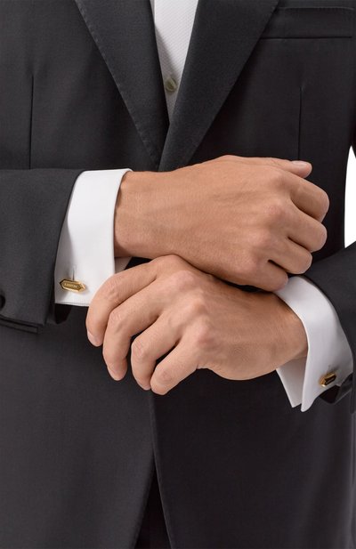 Круглые запонки с выгравированным логотипом марки изготовили из латуни с гальваническим покрытием золотом. Асимметричный аксессуар застегивается поворотной Т-образной застежкой.