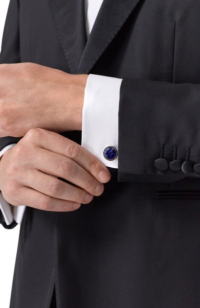 Круглые запонки с английской застежкой выполнили из латуни с палладиевым покрытием. Аксессуар с выгравированным логотипом декорировали полированным ониксом.