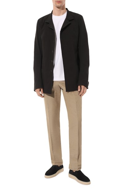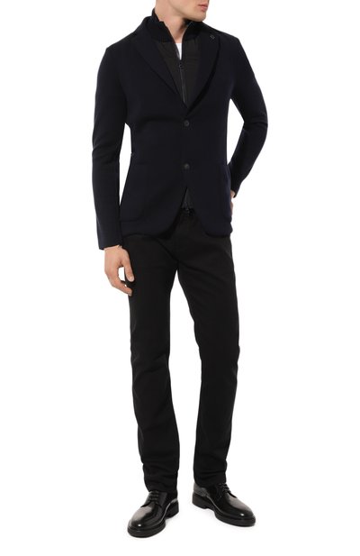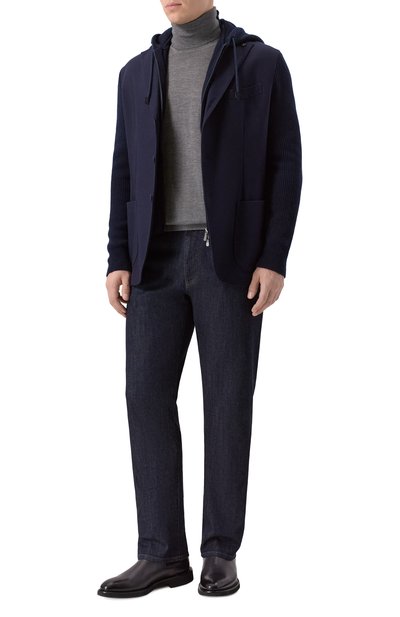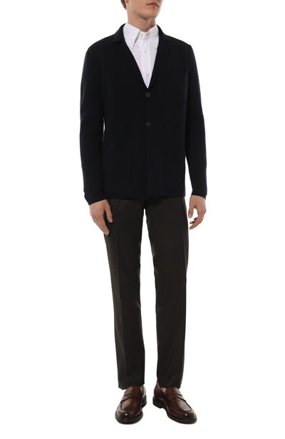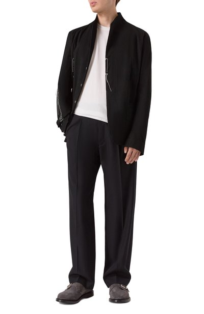 Однобортный пиджак с воротником-стойкой выполнили из полушерстяной ткани, напоминающей войлок. Модель с выведенными наружу швами дополнили боковыми карманами и шлицей сзади.
