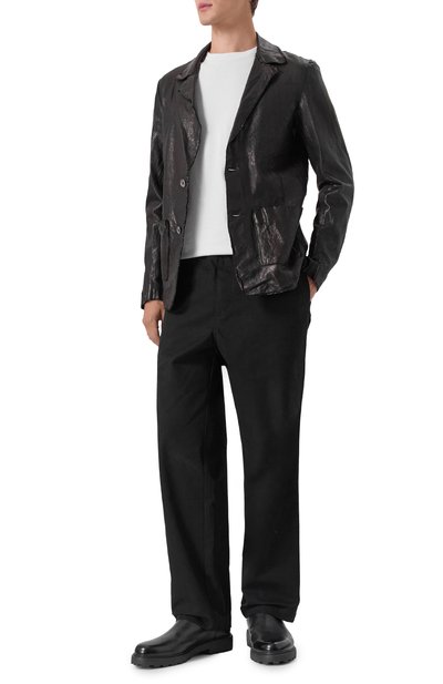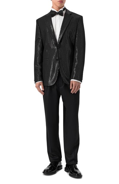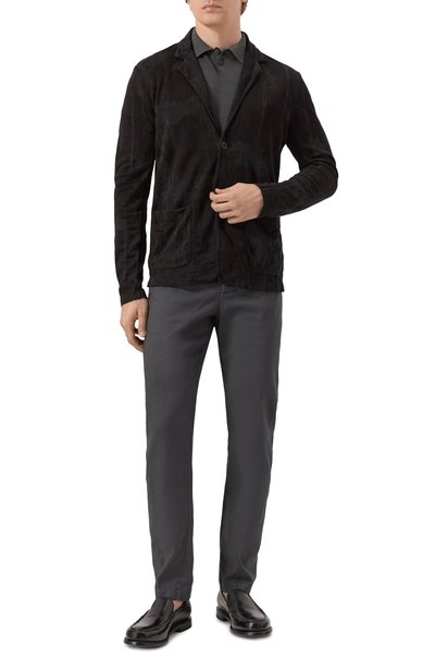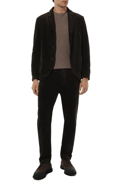 Пиджак со слегка спущенной линией плеч выполнили из хлопкового вельвета. Модель без подклада дополнили двумя шлицами сзади, нагрудным и парой боковых карманов.
