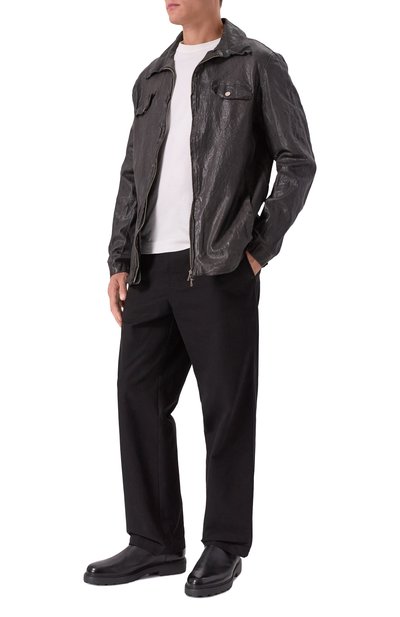 Для пошива косухи с небольшим клапаном спереди и широкими шлевками на поясе использовали мелкозернистую кожу. Сама куртка, рукава сзади и три кармана застегиваются молниями.