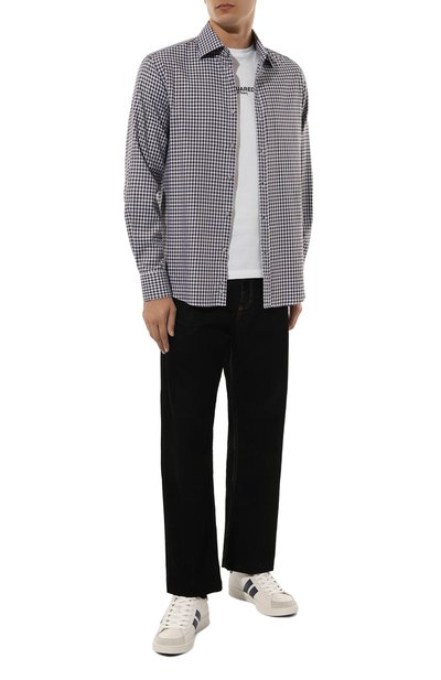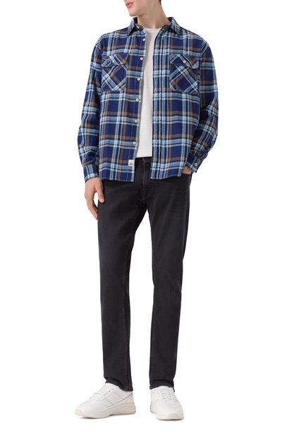 Рубашку с бантовой складкой на спинке, фигурным низом и прямоугольными манжетами украсили контрастным вышитым логотипом над одним из нагрудных карманов. Модель из хлопковой фланели с клетчатым узором застегивается перламутровыми пуговицами.