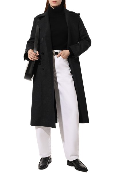 Утепленное пальто с двумя боковыми карманами выполнили из жатого нейлона. Модель с заостренными лацканами и спущенной линией плеч дополнили узким шнуром, продетым в кулиску на талии. Спинку изделия украсили фирменным патчем.