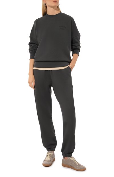 Свитшот со спущенной линией плеч сшили из хлопкового трикотажа. Спереди укороченную модель с манжетами, поясом и горловиной в рубчик украсили брендированным принтом с розами.
