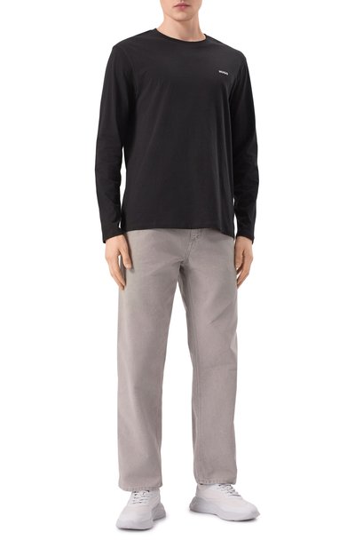 Oversize-лонгслив изготовили из хлопкового трикотажа. Модель с круглой горловиной в рубчик и слегка спущенной линией плеч украсили едва заметной символикой марки с переди и сзади.