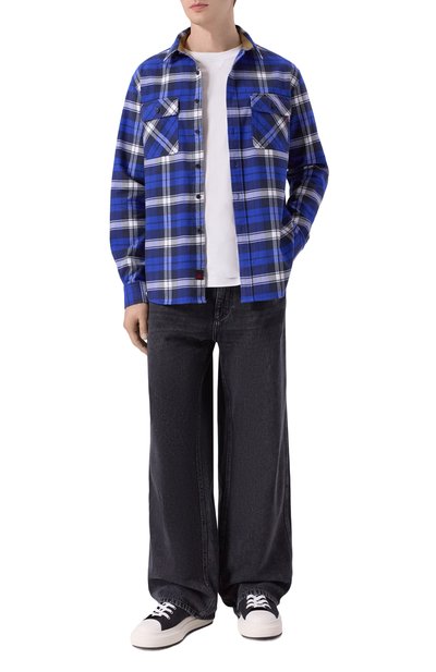 Для изготовления рубашки использовали хлопковую фланель с клетчатым узором. Модель с фигурными низом, прямоугольными манжетами и нагрудным карманом украсили брендированной накладкой на планке с кнопками.