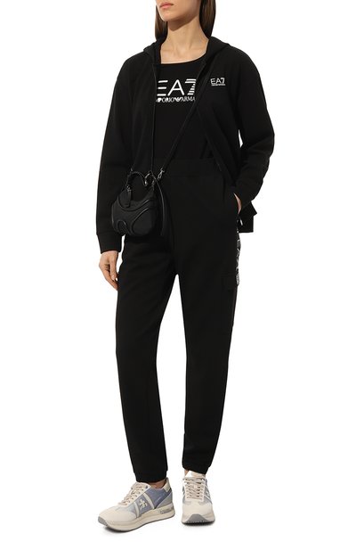 Футболку с рифленой горловиной и спущенной линией плеч выполнили из хлопкового джерси. Спереди модель украсили крупным контрастным логотипом.