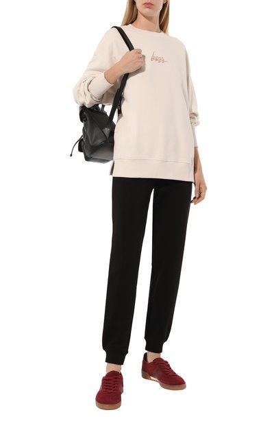 Джоггеры с двумя боковыми карманами и эластичным поясом-кулиской выполнили из хлопка с добавлением полиэстера. Спереди модель украсили контрастным вышитым логотипом марки.
