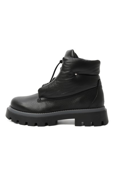 Ботинки на литой резиновой подошве с протектором выполнили из телячьей кожи. Модель с петлей на голенище и короткой молнией сбоку украсили четырьмя ремешками, соединенными кольцом.