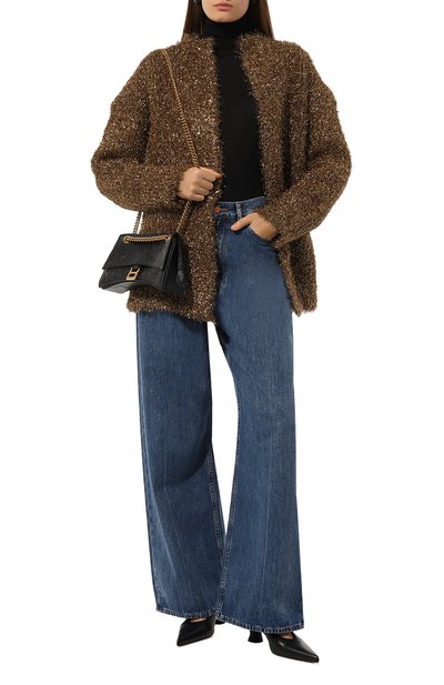 Для создания кардигана с леопардовым узором использовали трикотаж на основе мохера, полиамида и шерсти. Модель с V-образным вырезом и контрастной окантовкой застегивается пуговицами.