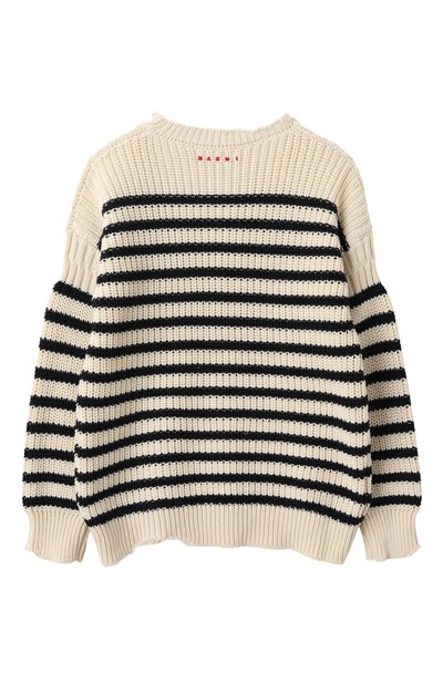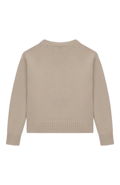 Свитер связали из шерсти первого пострига с добавлением акрила. Модель с отделкой в рубчик украсили контрастным жаккардовым узором с логотипом спереди.