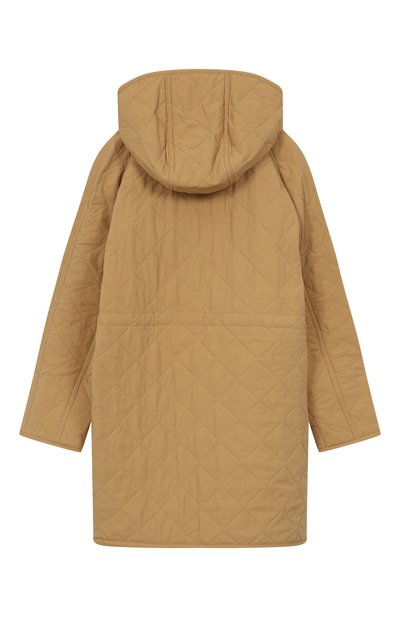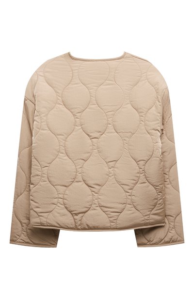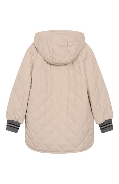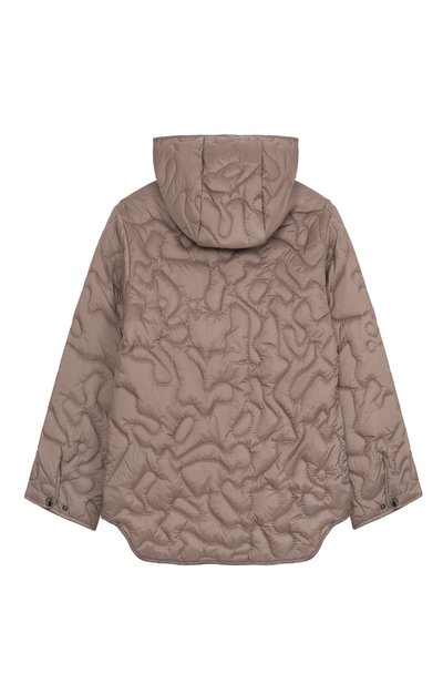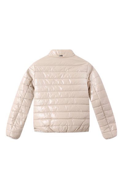Стеганую куртку с воротником-стойкой и боковыми карманами выполнили из искусственного полиэстерового меха. Утепленная модель, украшенная фирменной нашивкой спереди, застегивается молнией.