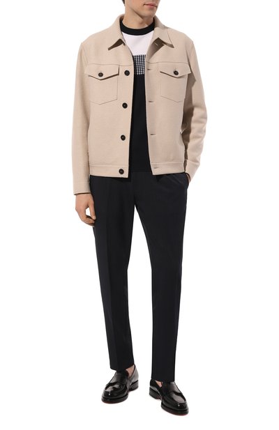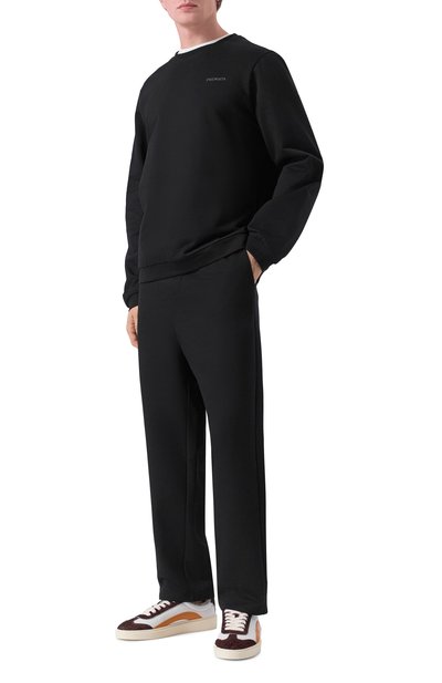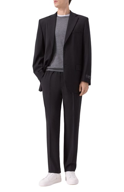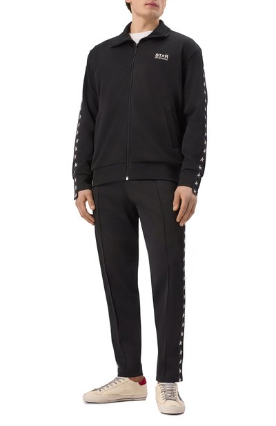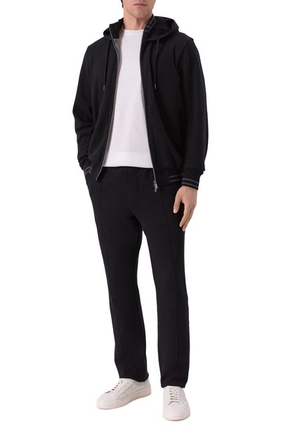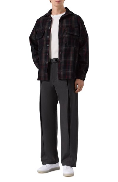Брюки с эластичным поясом сшили из трикотажа стрейч на основе полиэстера с добавлением хлопка и лиоцелла. Модель прямого кроя дополнена четырьмя карманами.