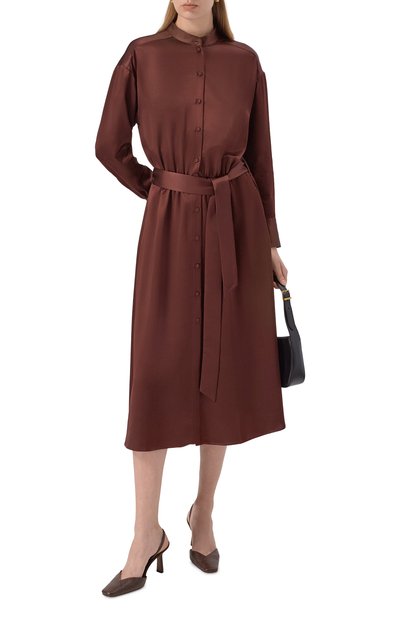 Платье с глубокими круглыми вырезами спереди и сзади выполнили из стрейчевого вискозного трикотажа. Модель с облегающим лифом, заниженной талией и расклешенным драпированным подолом поладит и с туфлями на шпильке, и с обувью без каблука.