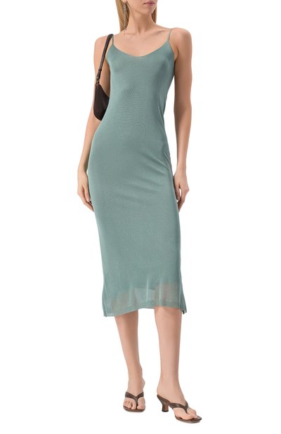 Макси-платье на узких бретелях выполнили из рифленого стрейчевого трикотажа на основе купро. Облегающую модель оставили без декора, поэтому она станет основой образов разной степени сложности.