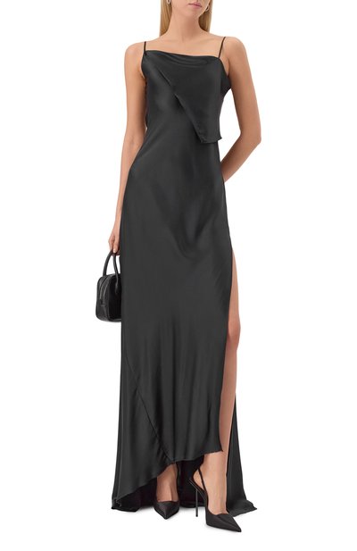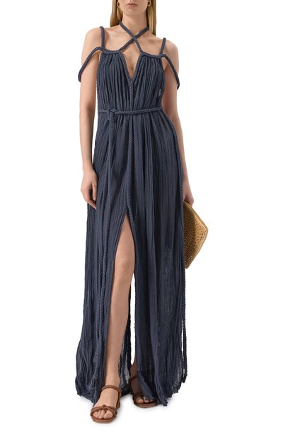 Рифленое платье с вырезом халтер и широкими бретелями выполнили из стрейчевого трикотажа на основе купро. Модель с открытой спиной и расклешенным подолом застегивается потайной молнией сбоку.
