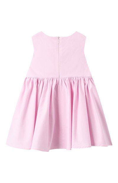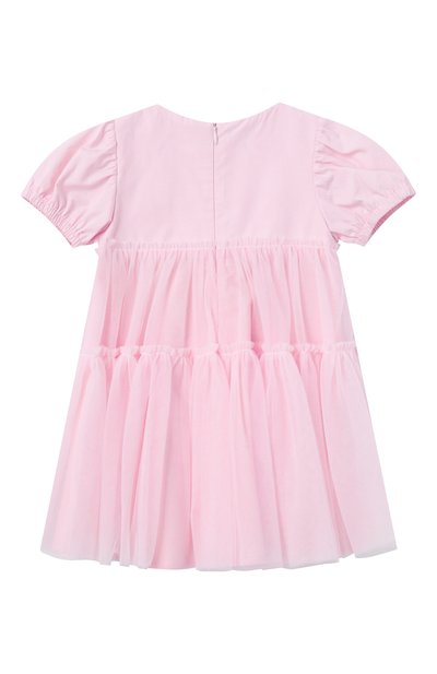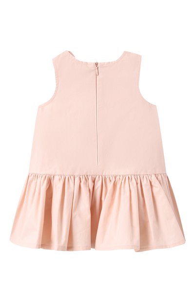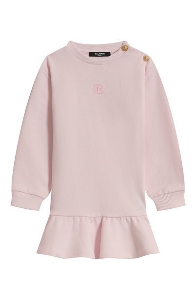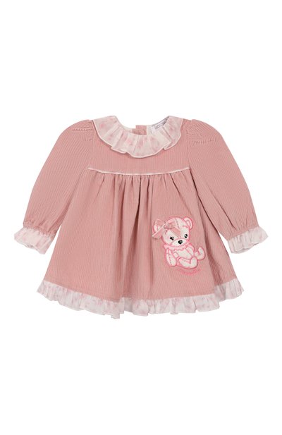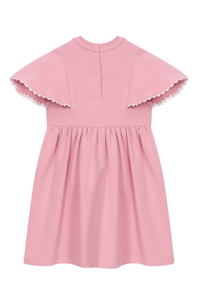 Для создания комплекта использовали хлопковый трикотаж. Платье на кнопках украсили кристальной эмблемой марки и оборками, а эластичные проймы шорт отделали воланами.
