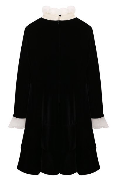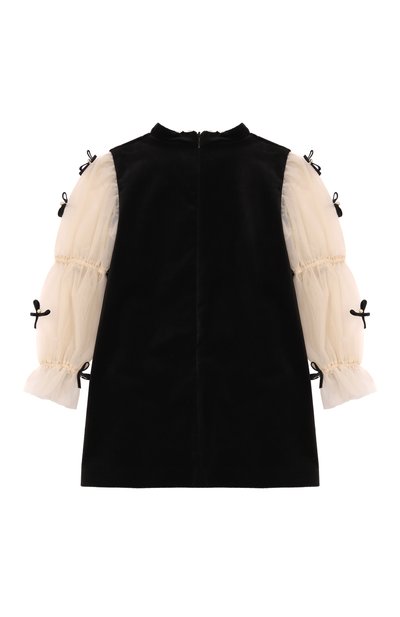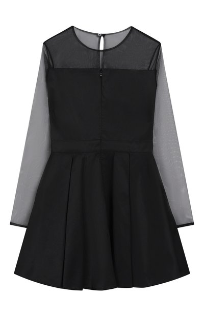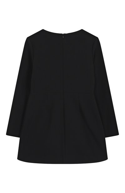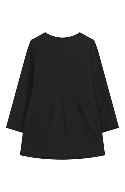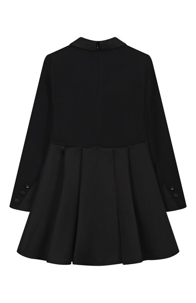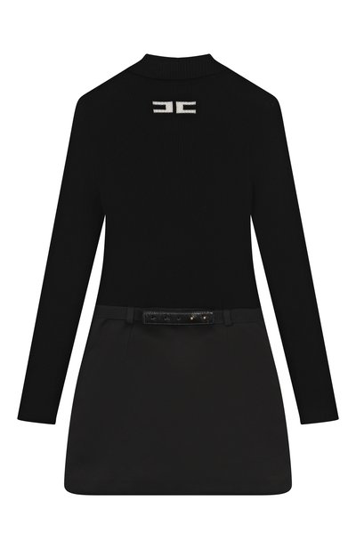 Платье с короткой молнией, напоминающее комплект из пуловера и юбки, выполнили из гладкой ткани и ребристого трикотажа на основе вискозы. Сзади изделие со съемным поясом украсили жаккардовой эмблемой бренда.