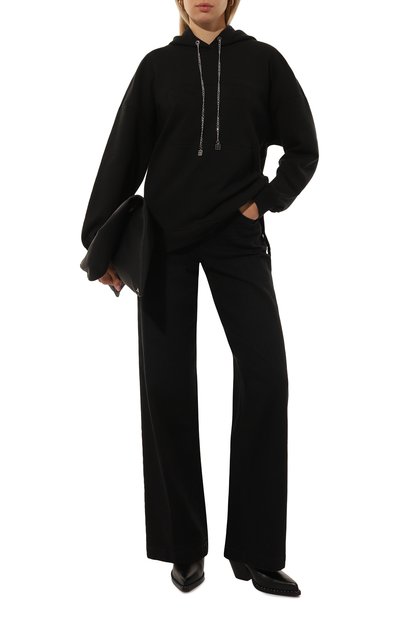 Худи с короткой молнией выполнили из трикотажа Milano стрейч на основе вискозы и нейлона, а для отделки изделия использовали атлас в тон. Модель с регулируемым капюшоном дополнили кулиской по низу.