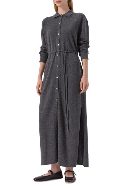 Миди-платье с отложным воротником, приспущенной линией плеч и планкой на четырех пуговицах украсили контрастным цветочным узором. Модель выполнили из чистой шерсти первого пострига.