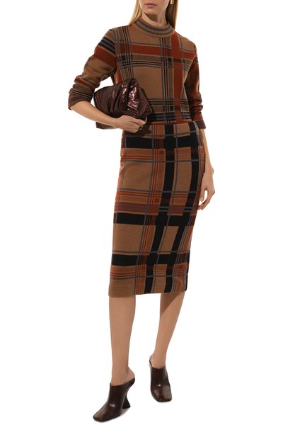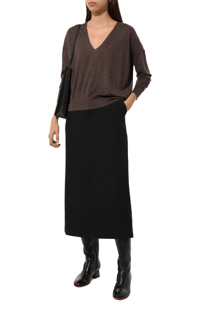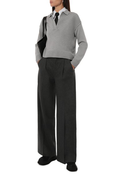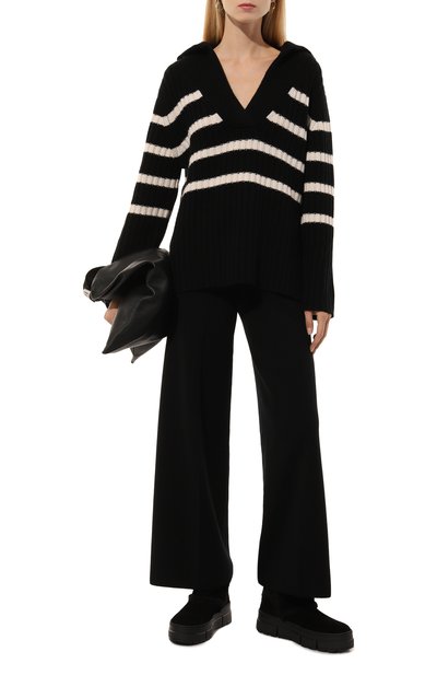 Полосатый пуловер с горловиной, поясом и манжетами в рубчик связали из шерсти первого пострига с добавлением шелка и кашемира. Модель со спущенной линией плеч застегивается перламутровыми пуговицами.