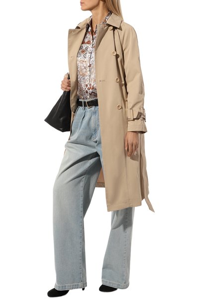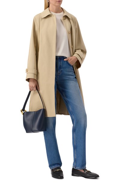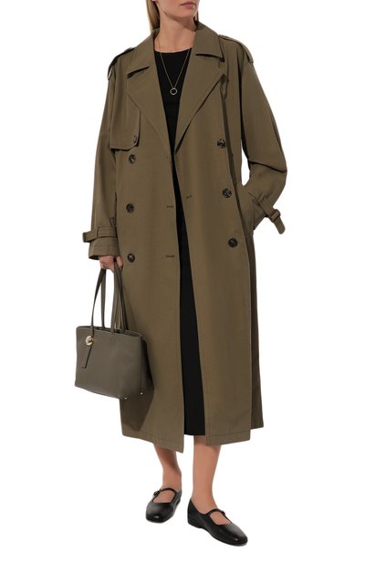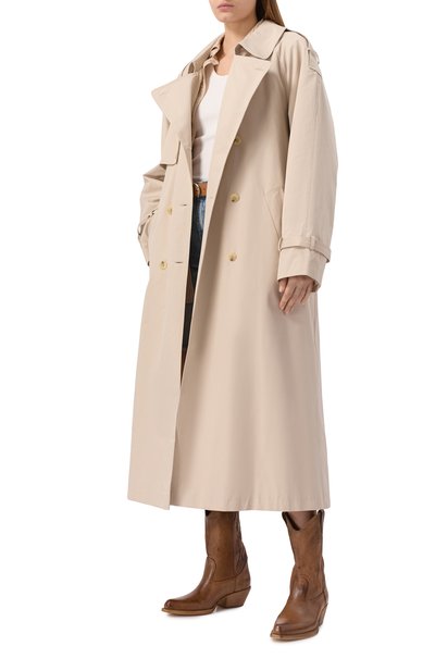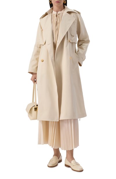 Стеганый тренч с патами на рукавах реглан и боковыми разрезами выполнили из нейлона. Модель с двумя карманами дополнили съемным поясом-лентой.