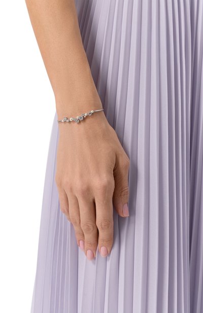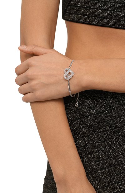 Браслет Mesmera с карабином и цепочкой для регулировки длины выполнили из полированной латуни с родиевым покрытием. Аксессуар декорировали прозрачными кристаллами разных форм.