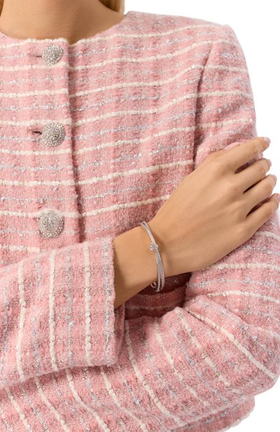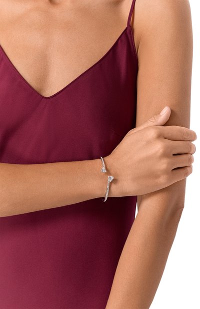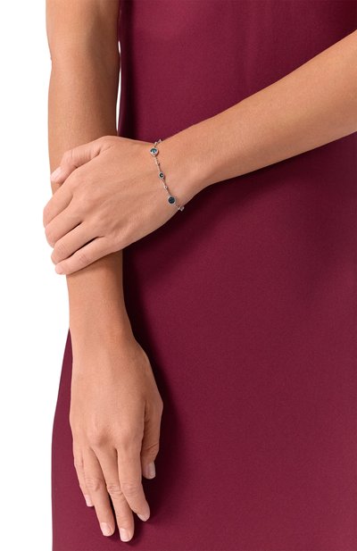 Браслет Imber Emily Tennis с раскладывающимся замком выполнили из латуни с гальваническим покрытием родием. Аксессуар инкрустировали дорожкой из сверкающих кристаллов. Такой же камень украшает фигурную вставку-удлинитель.