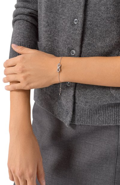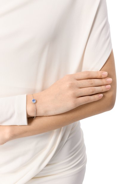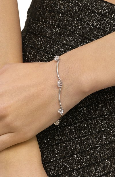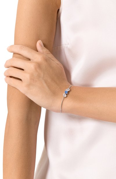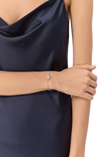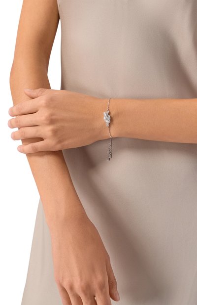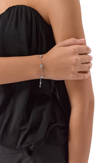 Браслет-цепочку Magic выполнили из латуни с гальваническим покрытием родием. Аксессуар со скользящим фиксатором украсили подвесками-снежинками с кристаллами и цирконием.